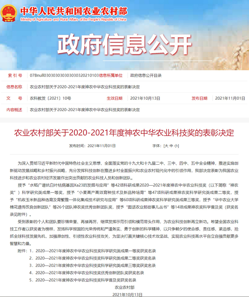 • 11月1日,农业农村部官网发布了《关于2020-2021年度神农中华农业科技奖的表彰决定》(农科教发〔2021〕10号),对在2020-2021年度为我国农业科技进步和农业农村经济发展作出突出贡献的农业科技人员和创新团队进行表彰。由江苏省农垦农业发展股份有限公司主持,联合江苏省农业技术推广总站、扬州大学共同完成的“稻麦两熟亩产1200公斤绿色高效关键技术创新与应用”项目获得科学研究类成果三等奖。