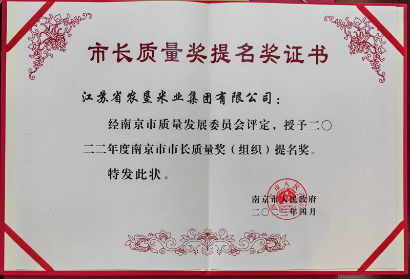 6月2日,2022年度南京市市长质量奖名单正式揭晓,苏垦米业荣获2022年度南京市市长质量奖(组织)提名奖。