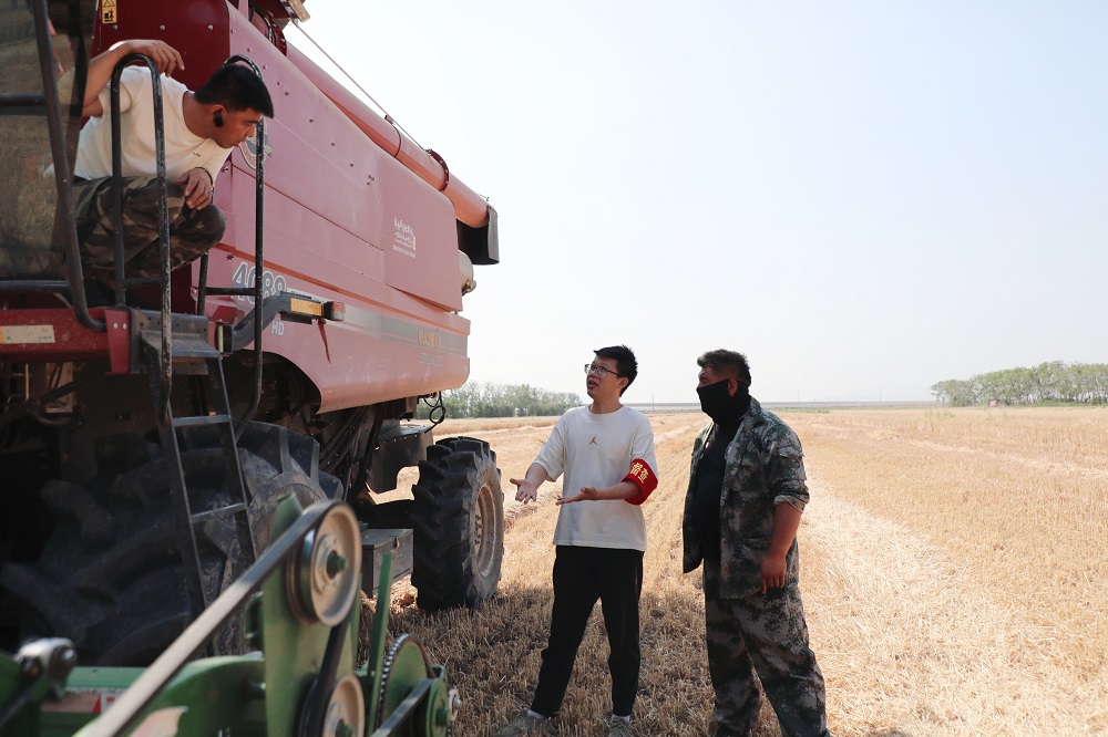 6月9日正午时分,在苏垦农发东辛分公司东陬生产区,伴随着收割机的轰鸣声,饱满的麦粒顺着出麦口倾泻进入运输车里。“师傅,您的收割机速度有点过快,割台高度偏高,收割后茬口超过10cm,请您放慢速度,注意收割质量。”在机收现场,太阳像个大火球似的悬在天上,远处走来几名佩戴着“红袖章”的督查员,他们头顶草帽,手拿测量工具,在麦田里随机取样抽检每框损失粒数,仔细检查一台台收割机是否操作规范,一辆辆运粮车是否存在跑粮、漏粮等现象......他们不畏似火骄阳,不惧蚊叮虫咬,坚持值班站岗,在田间地头穿梭巡逻,帮助生产区抢收抢种。他们恪尽职守,随时保持“战备”状态,奋战在服务“三夏”生产第一线,成为了麦田里最美的守护者。