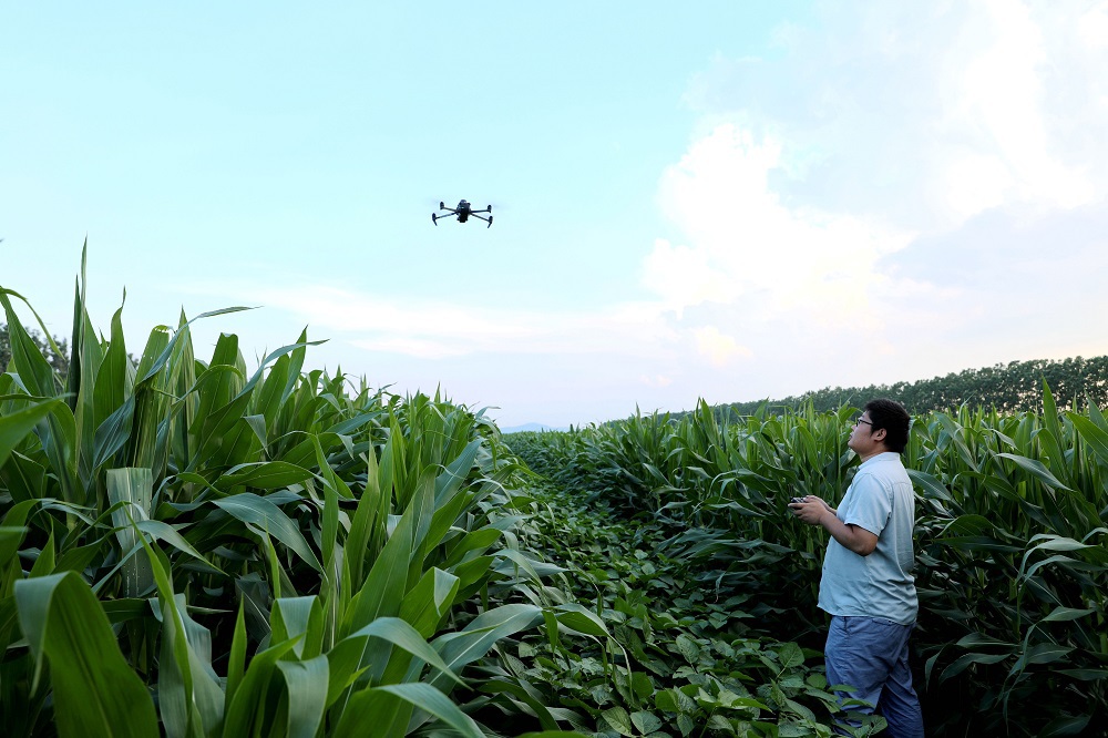 来到西洋生产区51大队,一垄垄绿油油的大豆玉米长势喜人。在大豆玉米高标准农田边,农业中心技术员程盘龙正熟练地操控着无人机进行巡田检查。随着无人机在头顶飞过,农田里的情况便能直接显示在操作盘屏幕上,作物长势、病虫害发生情况等均能进行实时查看。“以前生产检查,一天一组只能抽检几个大队,且只能对共性问题进行统一指导。现在有了无人机的帮忙,半天时间就能将所管辖区域的田块全部巡查结束,还可以深入田块的各个角落,对个别田块存在的生产问题,进行有针对性的技术指导,无人机巡田检查范围更广,工作效率更高,查看生产也更仔细。”程盘龙一边演示一边介绍。