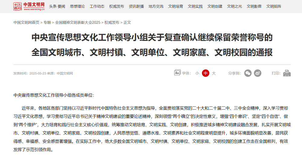 •        5月23日,中央宣传思想文化工作领导小组公布《关于认定命名第七届全国文明城市、文明村镇、文明单位和第三届全国文明家庭、文明校园的决定》和《关于复查确认继续保留荣誉称号的全国文明城市、文明村镇、文明单位、文明家庭、文明校园的通报》。苏垦农发顺利通过复查评估,继续保留“全国文明单位”称号,这是继2020年首创首成第六届“全国文明单位”后又一次获此殊荣。